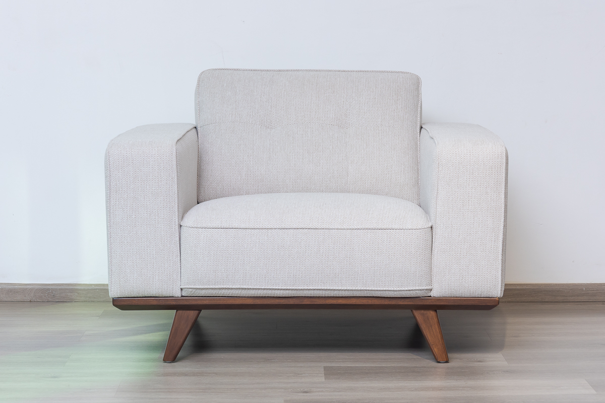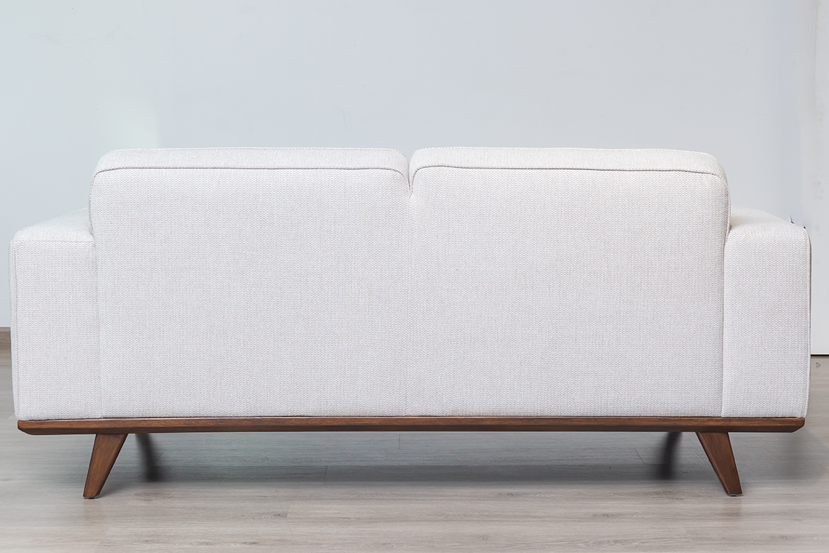 Stylish Contrast Legs: Angled wooden legs in a contrasting finish not only provide enhanced stability but also add a stylish visual element against the light upholstery.