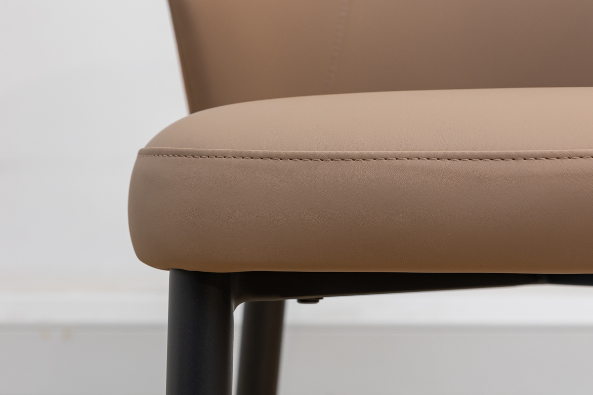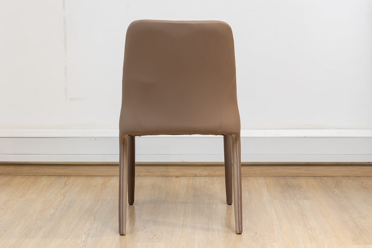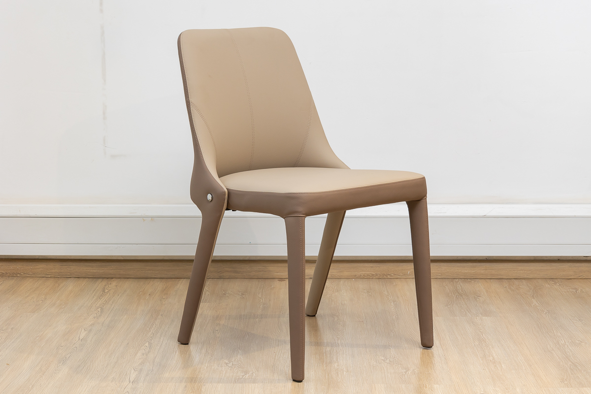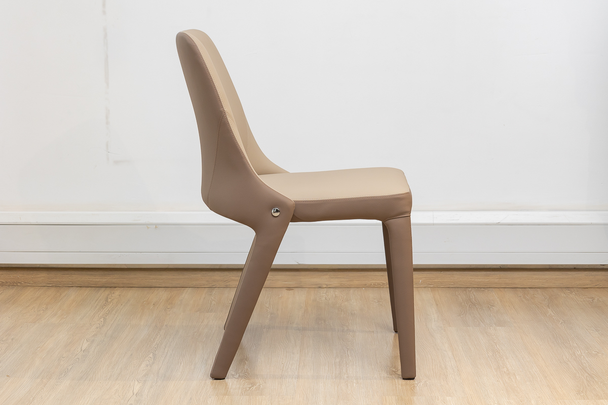 This elegant dining chair features a sleek, modern silhouette with a gently curved backrest and comfortable cushioned seat.