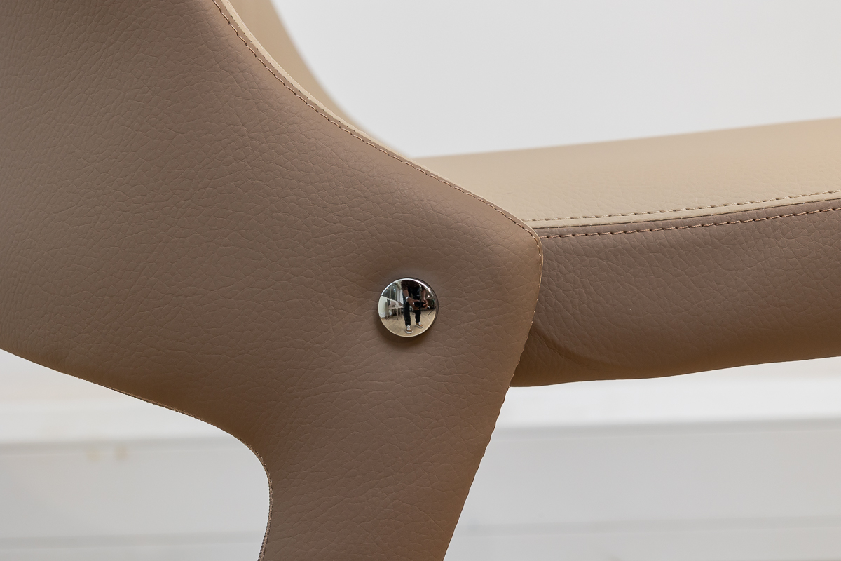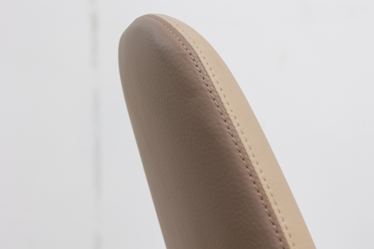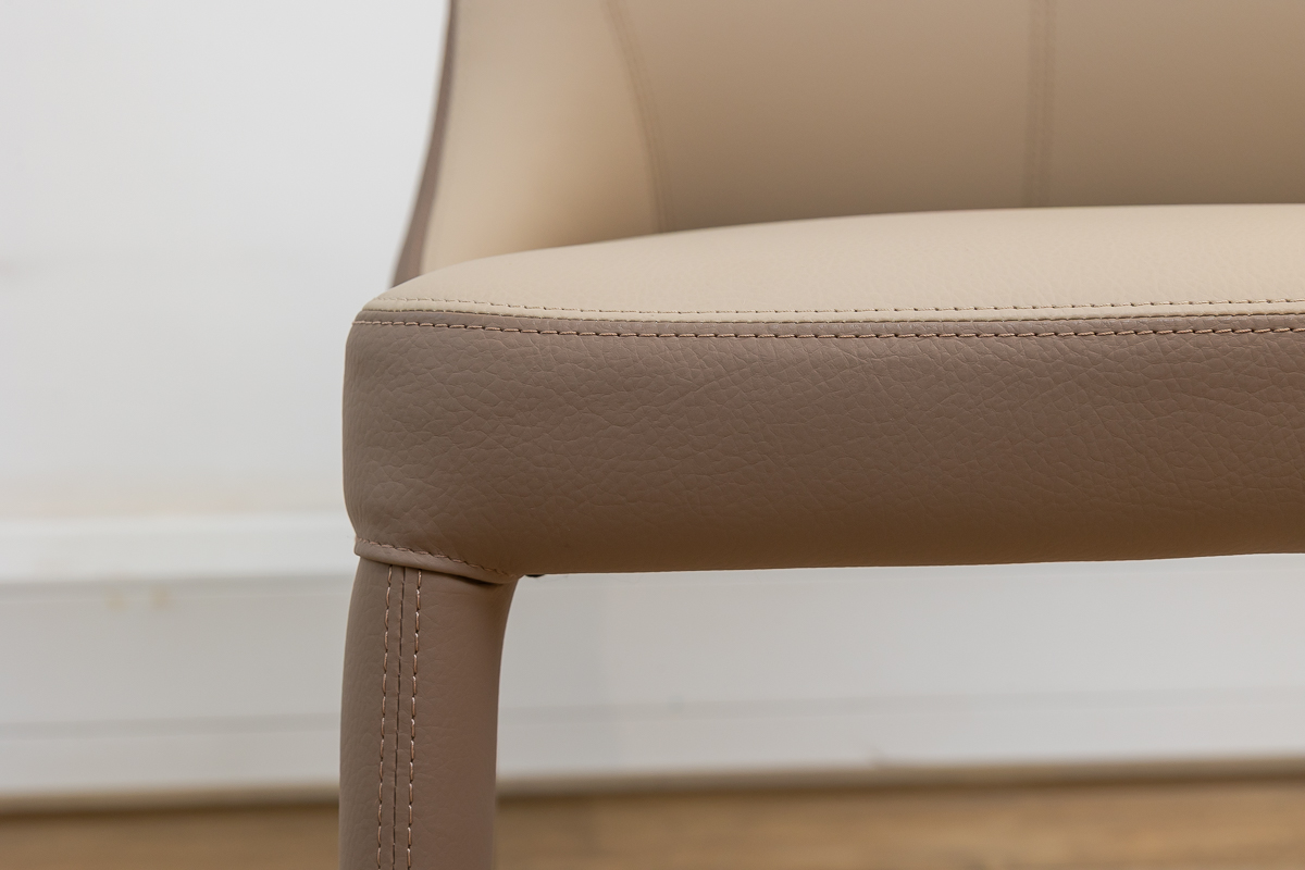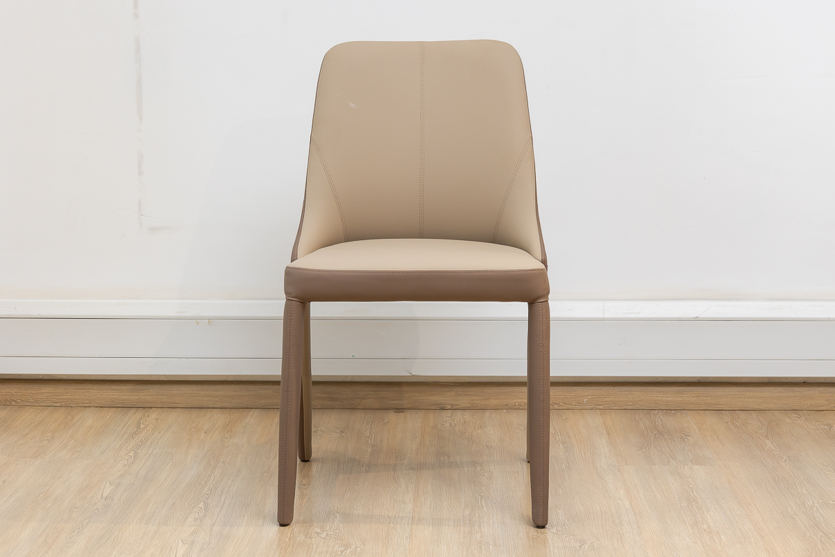 This elegant dining chair features a sleek, modern silhouette with a gently curved backrest and comfortable cushioned seat.